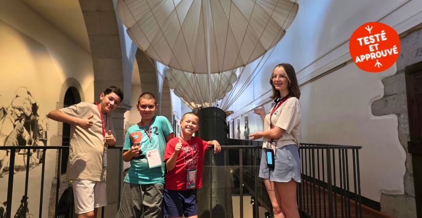 Diane (15 ans), Marlon (12 ans), Gaëtan (10 ans) et Martin (presque 8 ans) sont captivés devant les grandes scènes reconstituées au rez-de-chaussée et les parachutes suspendus dans les airs.